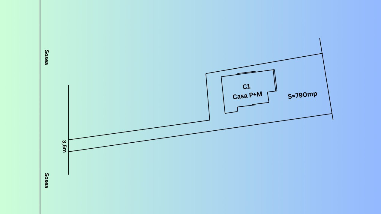 Proprietatea dispune de 790 mp teren, acces pe un drum cu latimea de 3,5m care face parte din geometria terenului.