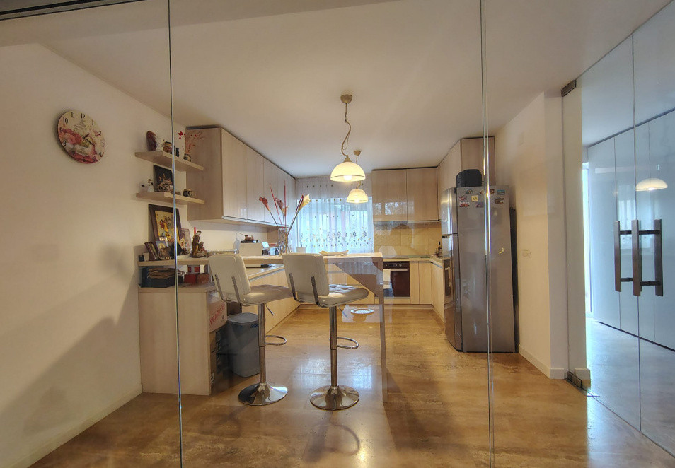 - Parter: hol acces, living (21 mp), bucatarie inchisa (18 mp) cu usi mobile din sticla, baie, camara, terasa de 18 mp cu acces catre curtea privata de aproximativ 18 mp;