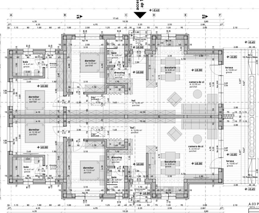- Parter: hol, living, 2 bai, 2 dormitoare, bucatarie, zona de dressing, terasa;
