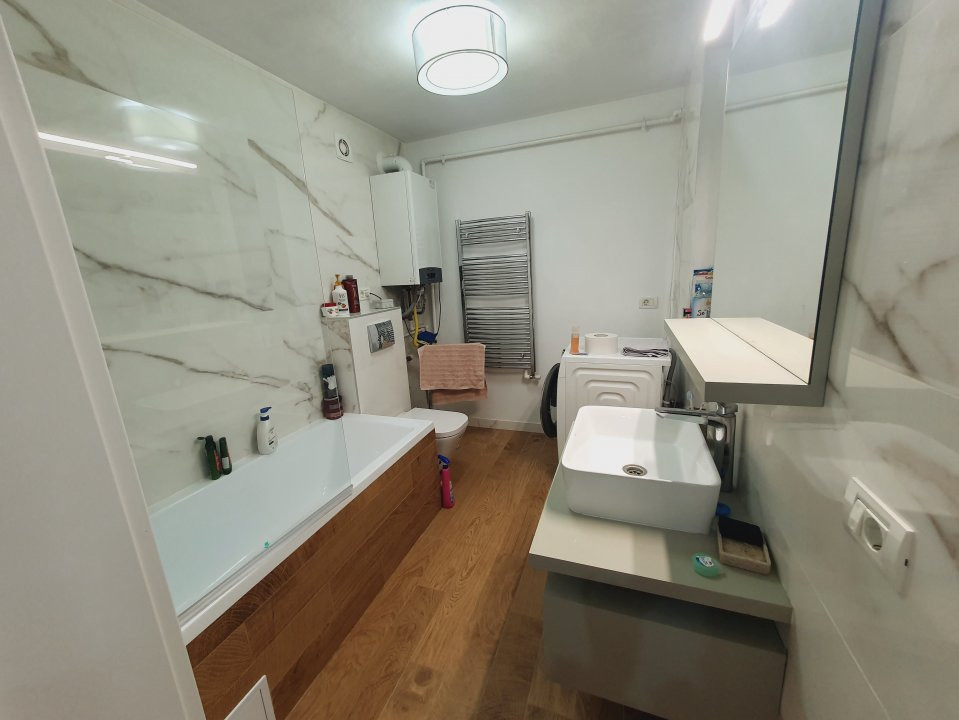 Casa se vinde mobilata si utilata: plita, cuptor cu functie de autocuratare, hota, masina de spalat rufe, masina de spalat vase, frigider cu congelator, cuptor cu microunde, expresor de cafea marca Aeg incorporabil. Imobilul dispune de centrala proprie cu incalzire in pardoseala si 2 locuri de parcare.