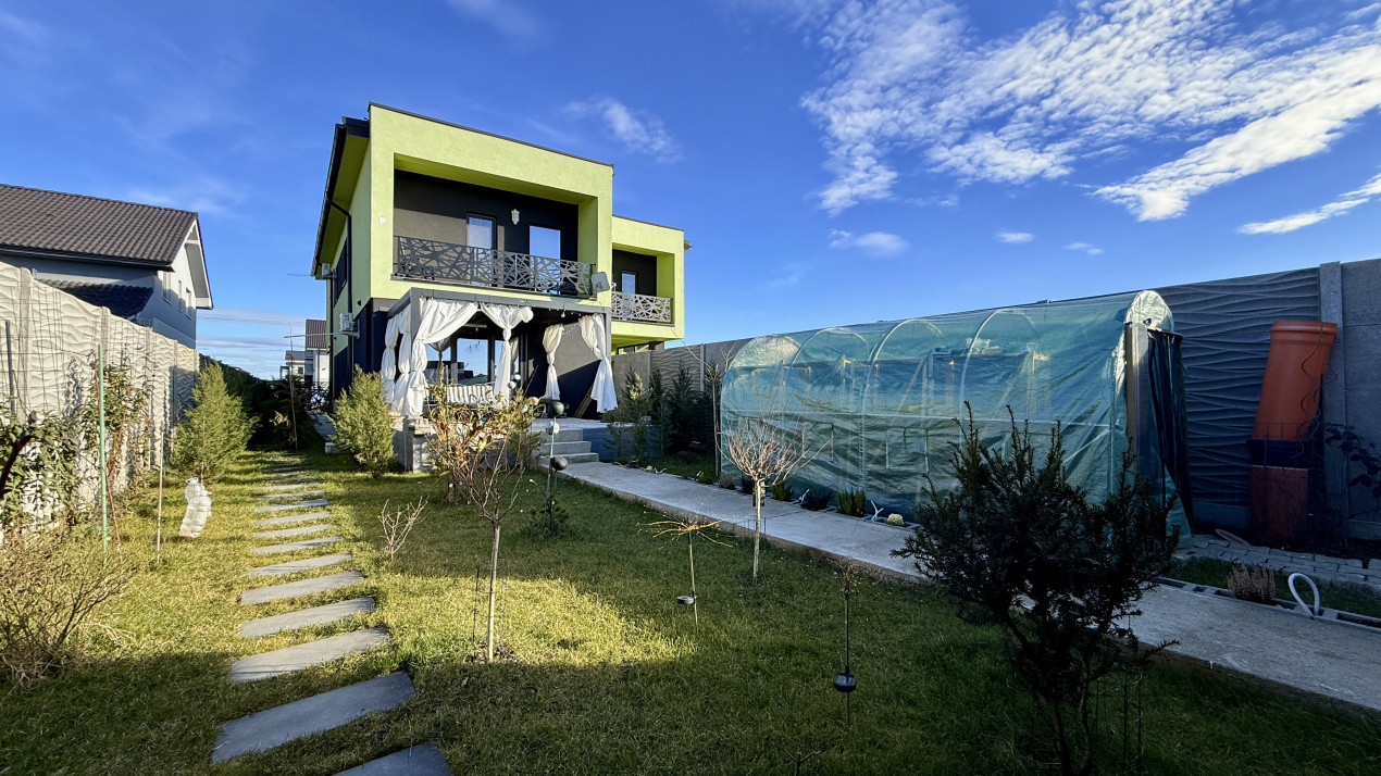 Imobilul dispune de centrala proprie cu incalzire prin pardoseala si 2 locuri de parcare, alei betonate, pomi ornamentali, predispozitie pentru camere video si alarma, termostat de ambient in fiecare camera.