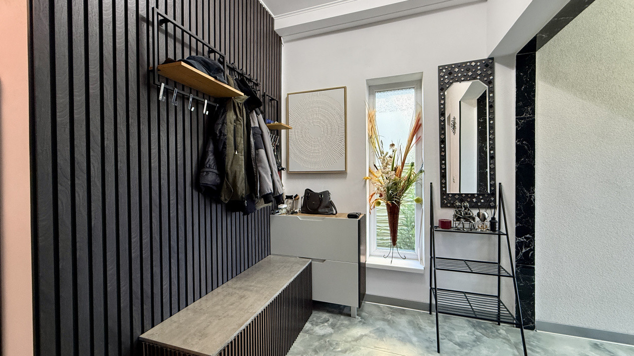 - Parter: hol, living + loc de luat masa, bucatarie, baie, camara si terasa;