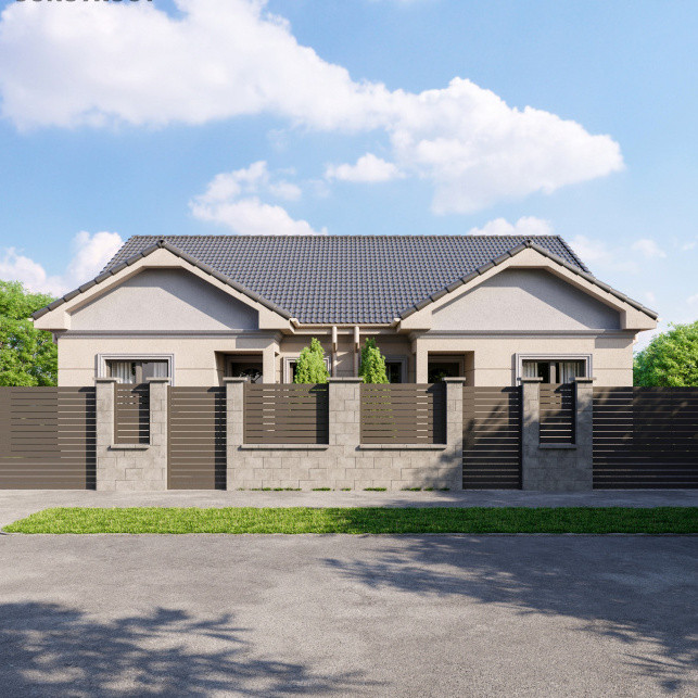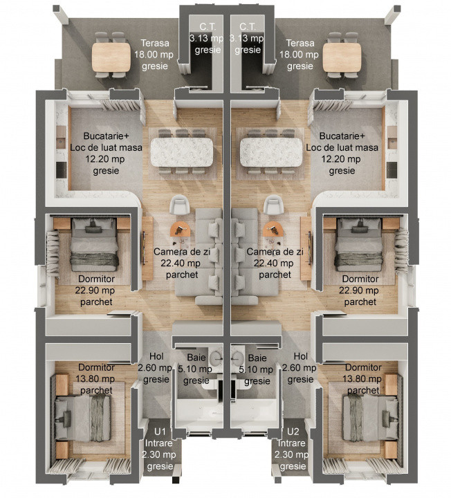 - Parter: hol, living, 2 dormitoare, 2 bai, bucatarie, camera tehnica si terasa;