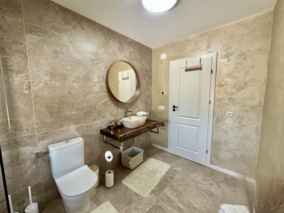 Se vinde complet mobilata si utilata, cu mobilier facut pe comanda si electrocasnice moderne (plita, cuptor, hota, frigider cu congelator, cuptor cu microunde, masina de spalat vase si rufe). Incalzirea este asigurata de centrala proprie si incalzire in pardoseala cu termostate individuale pe fiecare camera.