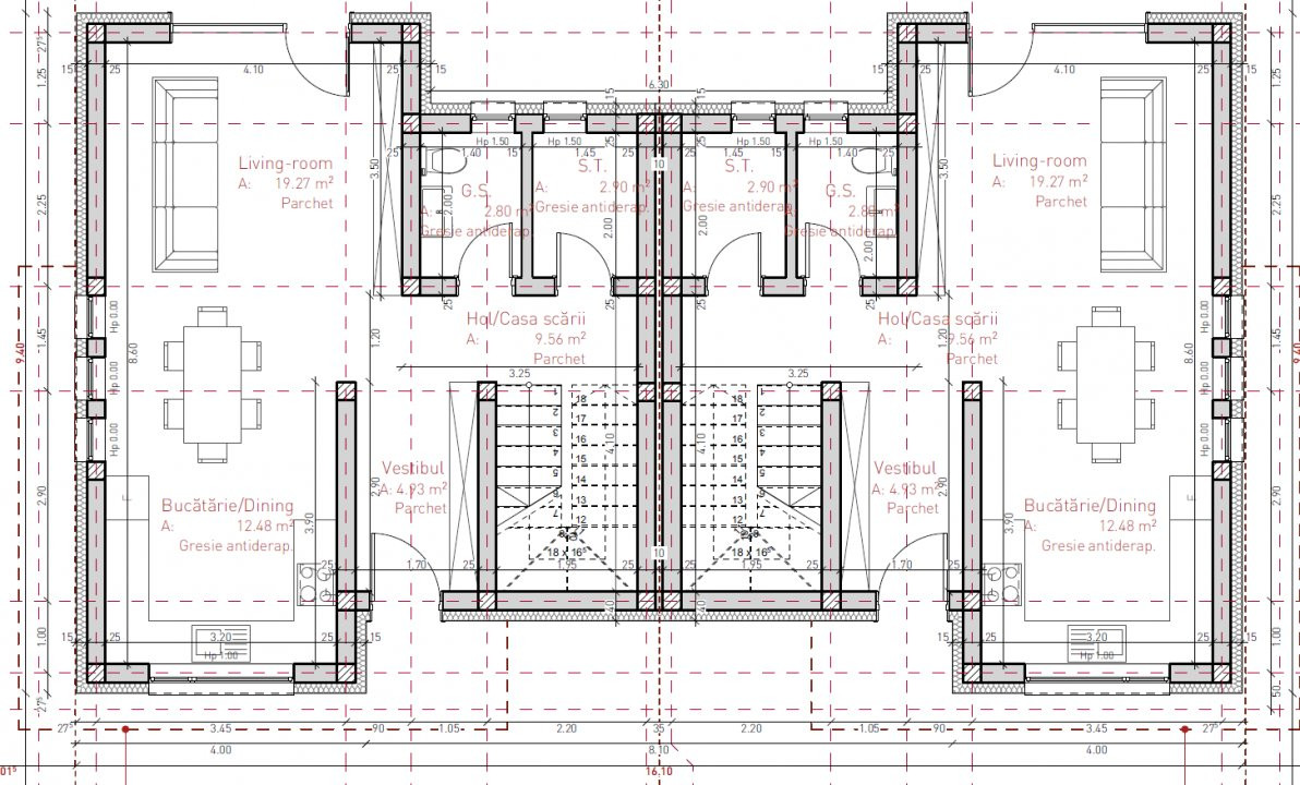 - Parter: hol, living cu bucatarie, grup sanitar serviciu, camera tehnica, terasa;