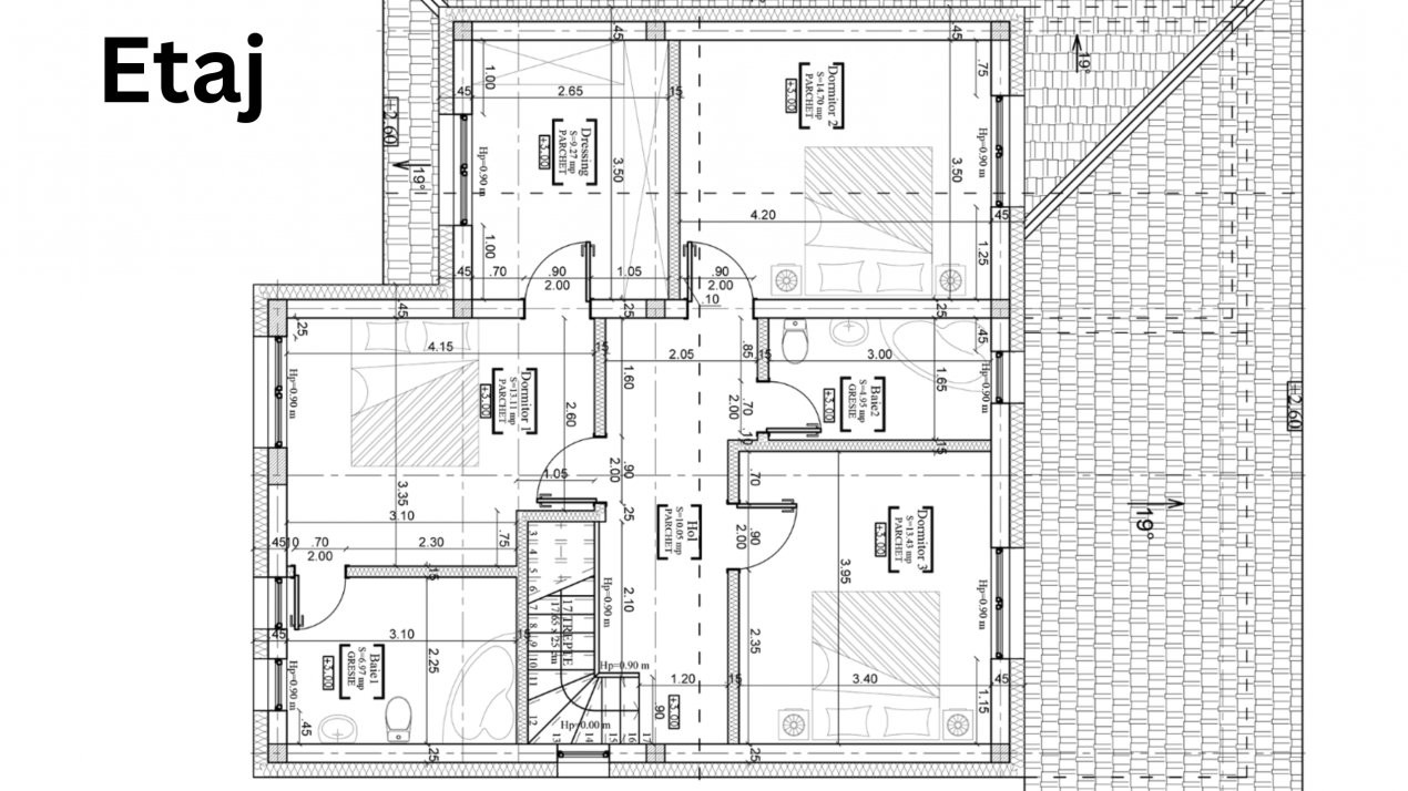 - Etaj: 3 dormitoare, 2 bai, dressing, hol.