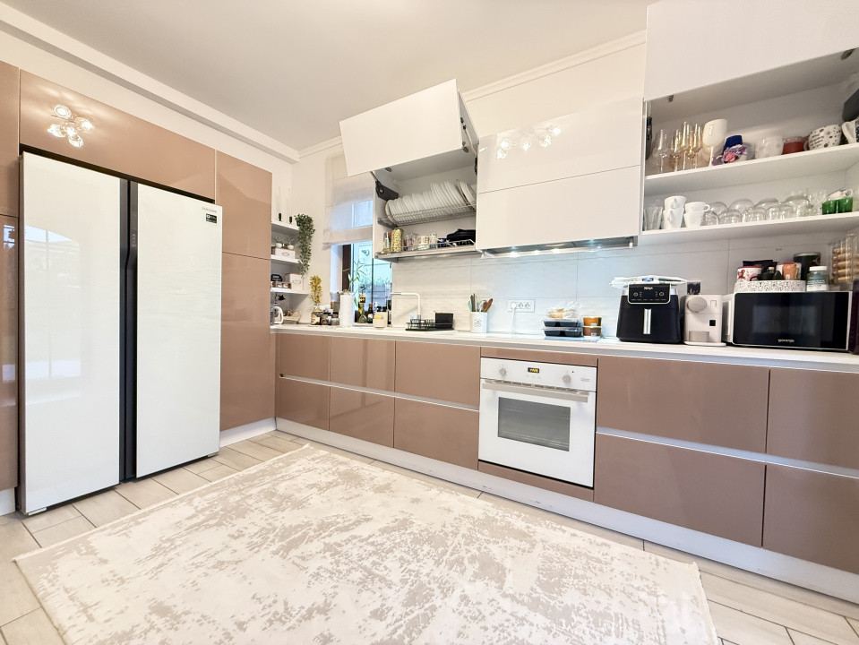 Casa se vinde mobilata si utilata: plita, cuptor, hota, masina de spalat rufe, uscator rufe, frigider cu congelator, cuptor cu microunde.