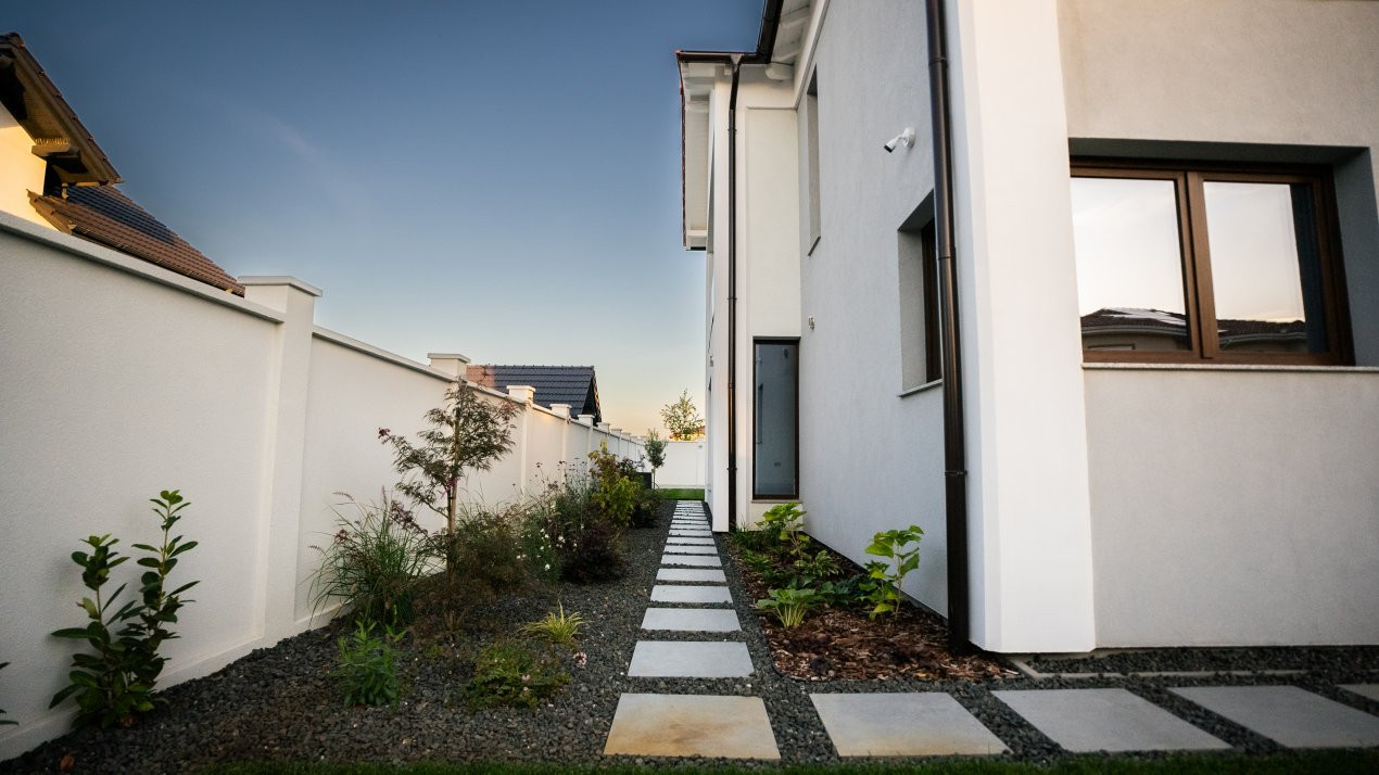 Imobilul este amplasat in Timisoara intr-o zona foarte buna, pe un teren mai mult decat suficient cu acces si loc pentru 2 masini, trotuare, plante ornamentale, arbusti si gazon irigate printr-un sistem de irigatii automatizat, o senzationala terasa acoperita, sistem de iluminat cu senzori crepusculari, sistem de supraveghere video, gard din beton finisat cu tencuiala decorativa si panouri de aluminiu vopsit in camp electrostatic avand portile automatizate.