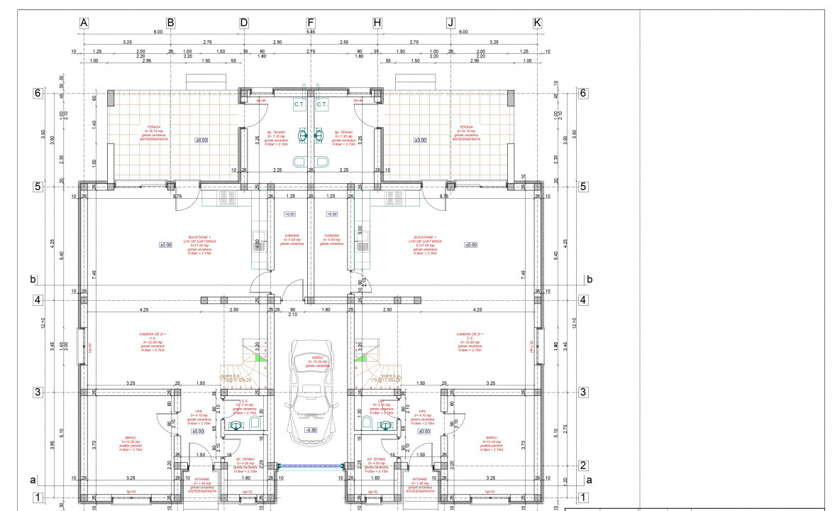 - Parter: hol acces, living, bucatarie, camara, birou, baie, spatiu tehnic, terasa baie;