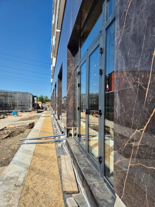 Peretii exteriori sunt realizati din caramida cu o grosime de 30 cm, sistem termoizolant cu polistiren 10 cm grosime si placati cu placi ceramice de dimensiuni mari (120x280cm si 6mm grosime).