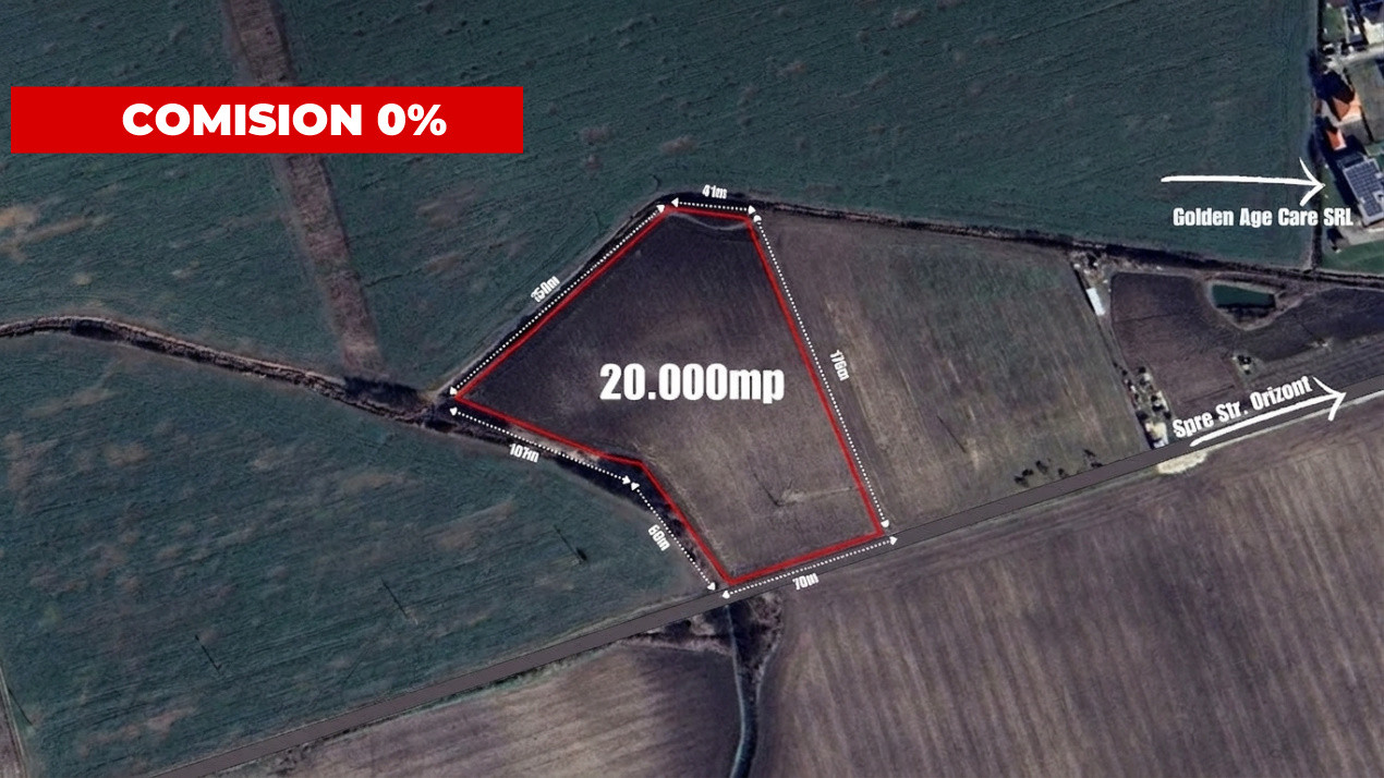 Acest teren de 2 hectare, situat in capatul strazii Orizont, aproape de Caminul de batrani Golden Age Care, beneficiaza de acces direct la drum de pamant (4m latime), cu front stradal de 70m.
