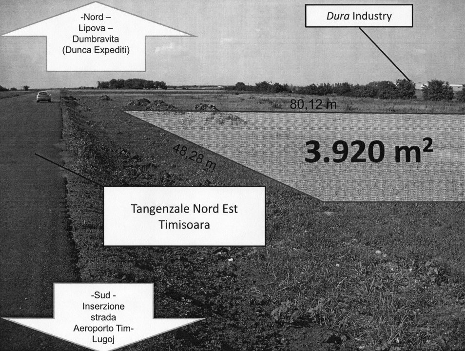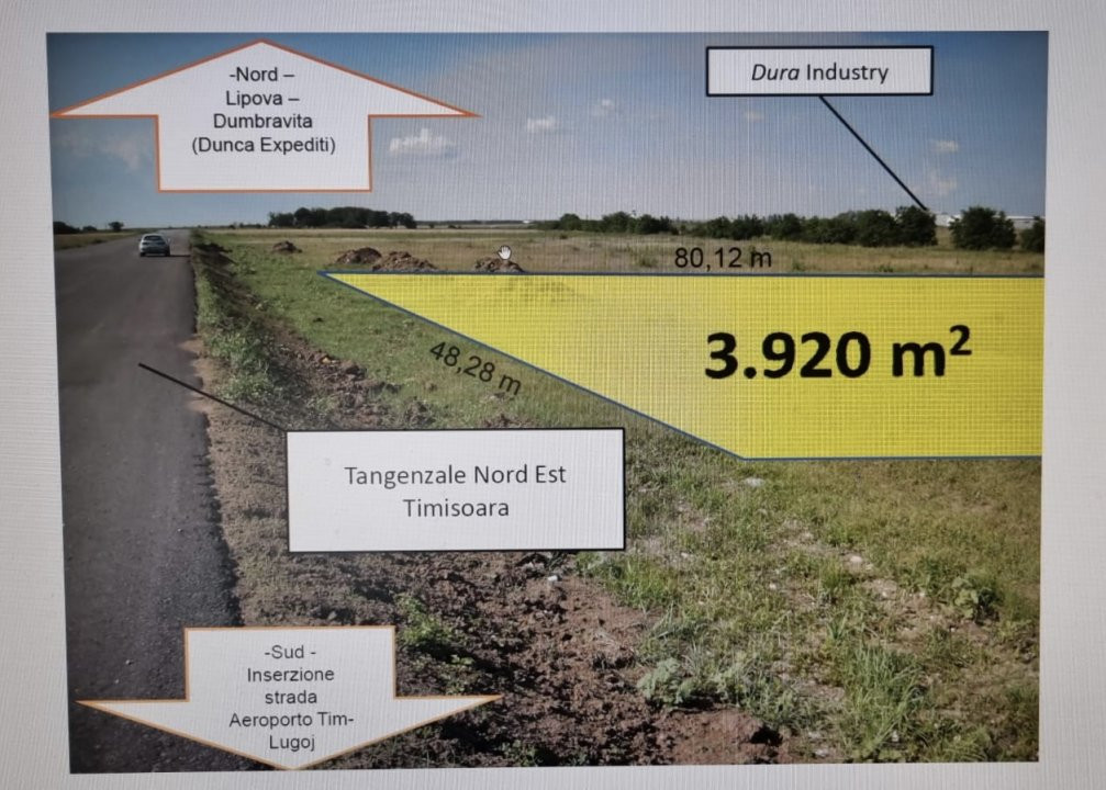 FOXFORT propune spre vanzare teren extravilan in localitatea Ghiroda - Aeroport -langa casa auto Ford, avand o suprafata de 3920 mp si deschiderea de 48,28 ml la strada, adancimea fiind de 81,19.